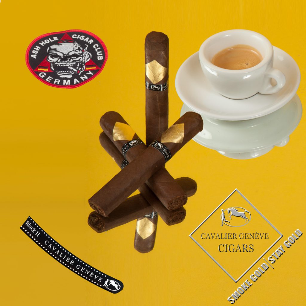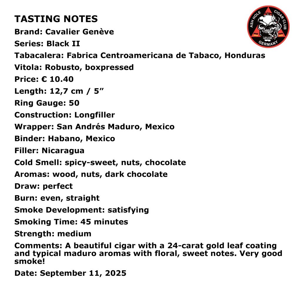 Nun haben wir unsere vergoldeten Schönheiten in Rauch aufgehen lassen. Die Robustos der Black II Serie von Cavalier Genève, kreiert vom Schweizer Sébastien M. Decoppet, tragen tatsächlich ein kleines Quadrat aus 24-karätigem Blattgold – das unverwechselbare Markenzeichen auf dem makellosen Maduro-Deckblatt aus dem mexikanischen San-Andrés-Tal.